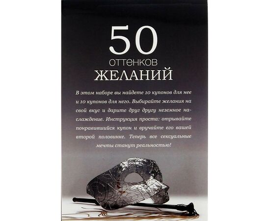 Добавьте страсть в отношения! Порадуйте себя и вторую половинку оригинальным подарком с пикантным содержанием. Горячие купоны 50 оттенков желаний разнообразят ваши будни!