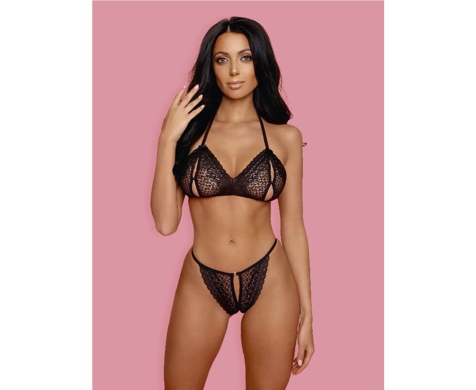 Комплект эротического белья от бренда Аморель, состоящего из кружевного бюстгальтера с вырезами в районе сосков и элегантных ажурных стринг с игривым вырезом.