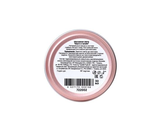 Натуральные масла в составе глубоко питают и увлажняют кожу. Растаявший воск превращается в масло для массажа. Свеча станет идеальным аксессуаром для романтического свидания. Идея для свидания: Приготовьте фруктовую тарелку и предложите партнеру окунуться в атмосферу отпуска. Зажгите массажную свечу. Предложите партнеру расслабиться в ожидании массажа. Погасите свечу и немного подождите, пока масло остынет. Лейте масло вдоль спины медленно, а затем начните с лёгких массирующих движений. Сделайте массаж своим обнаженным телом — так он станет ещё более интимным и чувственным. Такое свидание останется в памяти надолго! Свеча подарит незабываемые ощущения, после которых вам гарантированы нежные и мягкие прикосновения! Применение: Зажгите свечу до массажа. Когда образуется достаточное количество масла, погасите её. Проверьте температуру масла на внутренней стороне ладони, при необходимости дайте маслу немного остыть. Нанесите разогретое масло на тело и массирующими движениями распределите по телу.