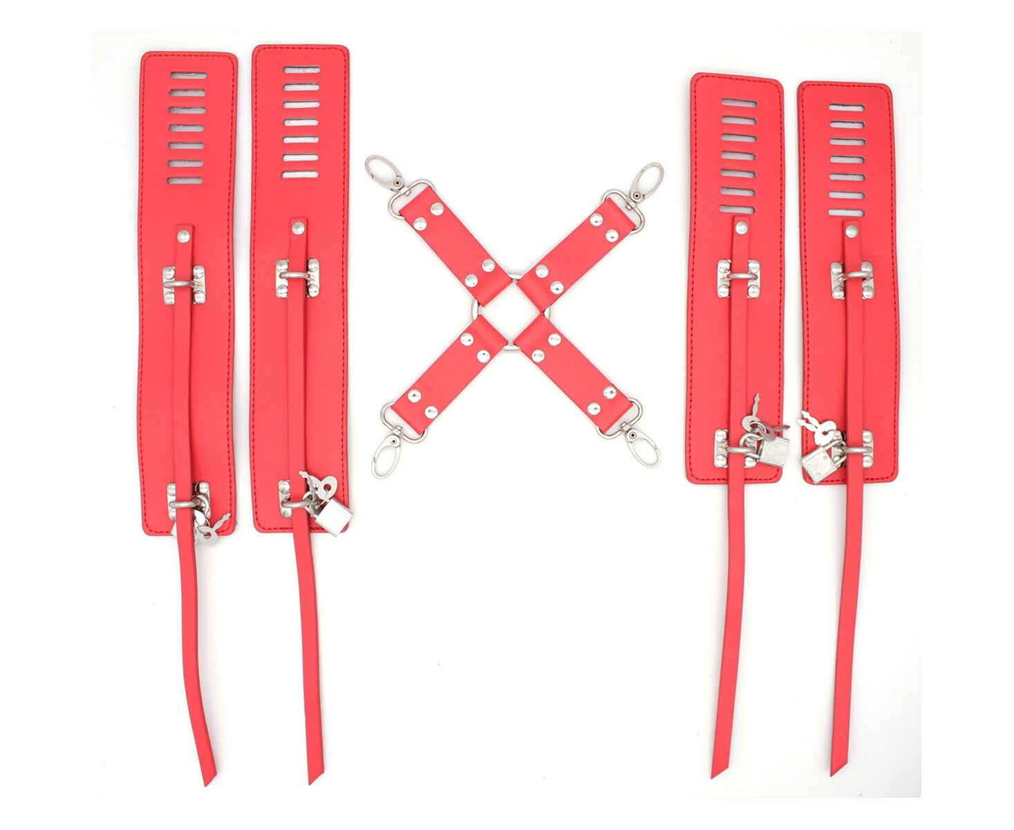Универсальный набор для бондажа состоящий из наручников, оков на ноги и соединительной части с кольцом на четырех карабинах (крест).