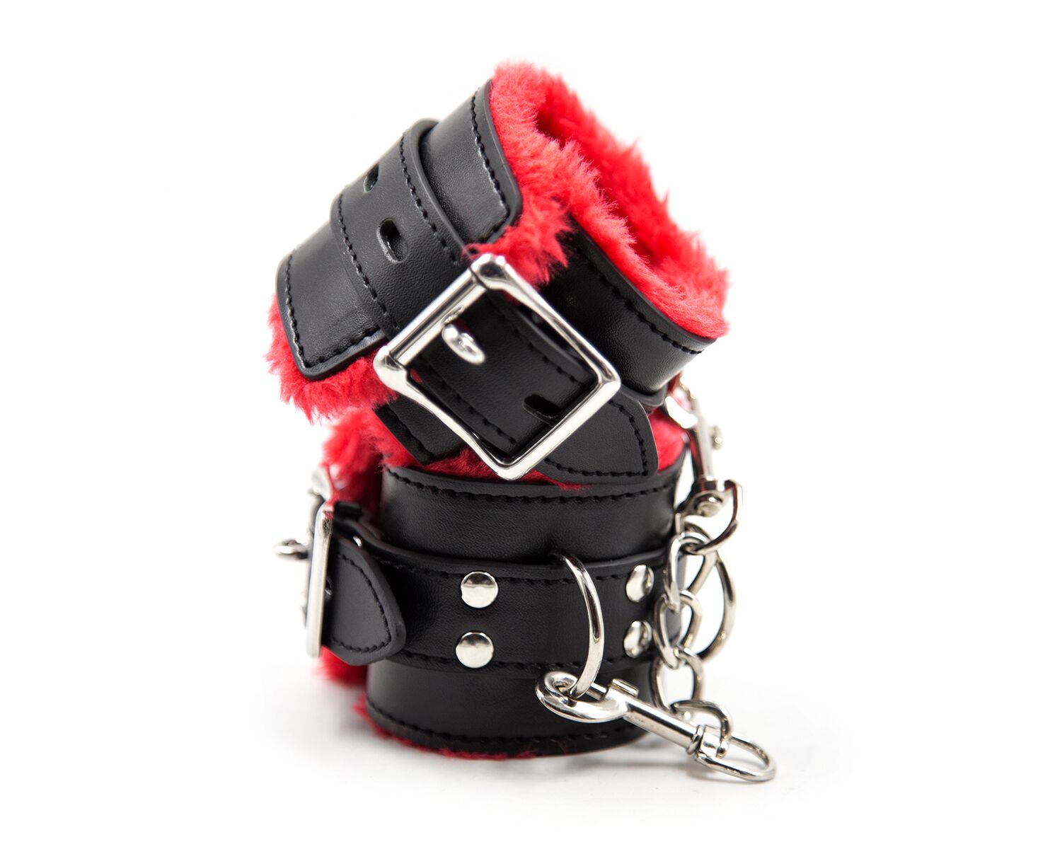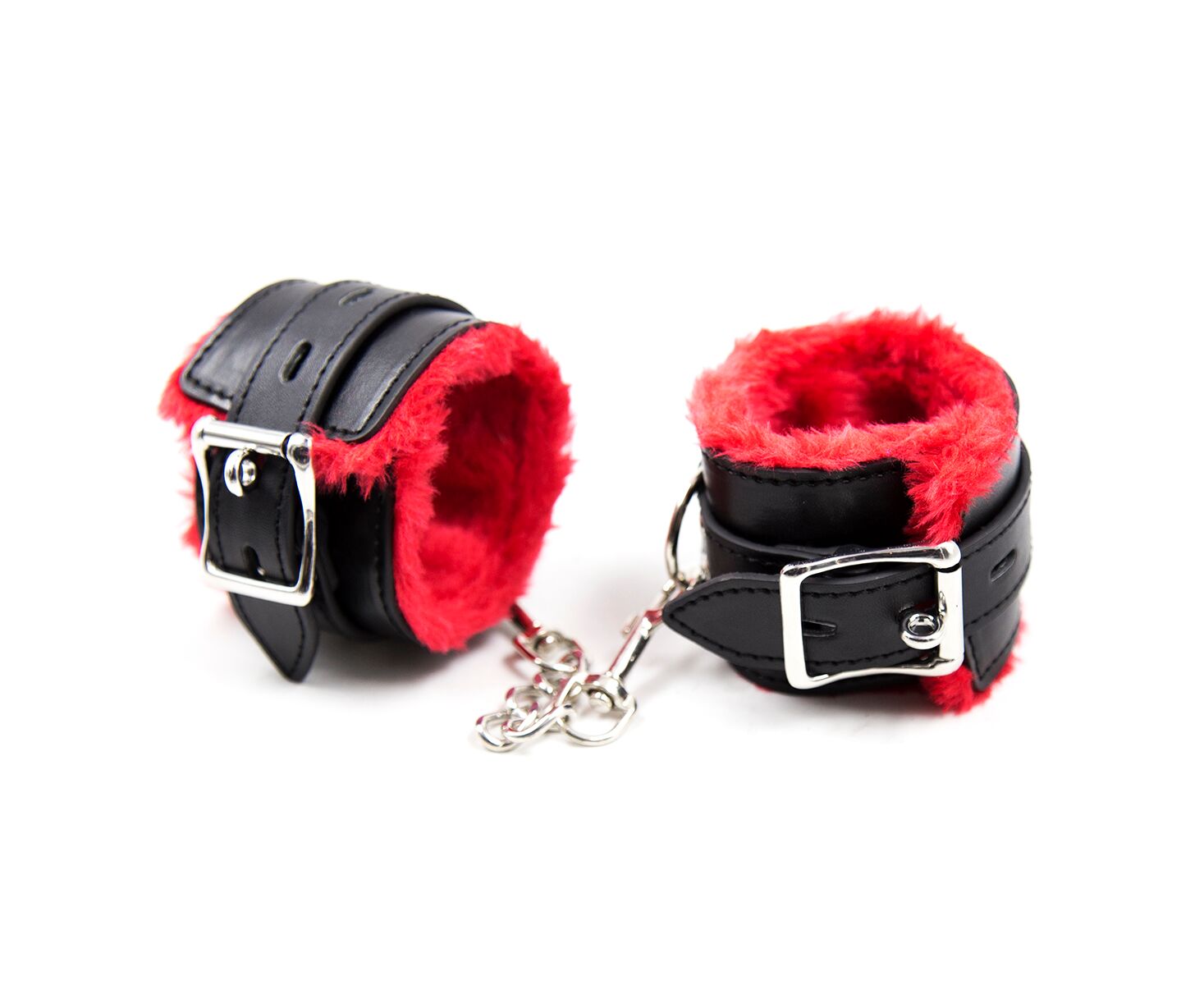 Наручники выполнены из толстой ременной кожи черного цвета. Строчка толстой ниткой контрастного красного цвета. Оковы на руки и ноги - это фиксаторы благодаря которым возбуждение будет нарастать даже в процессе одевания.