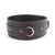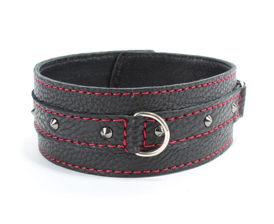 Черный кожаный ошейник с красной отстрочкой. Декорирован небольшими шипами в передней части изделия. Имеет D-кольцо для карабина. Имеет 7 отверстий для регулировки размера.