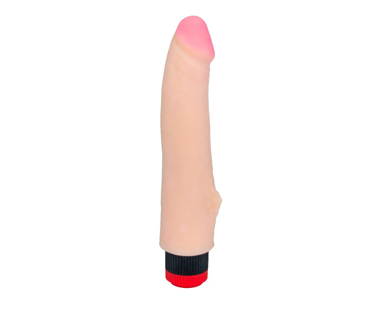Фаллопадобный вибратор телесного цвета изготовлен из реалистичного материала Неоскин, имеет среднюю длину и диаметр, выраженную головку, приятную на ощупь поверхность с имитацией вен и реле для регулировки скорости вибрации на корпусе.