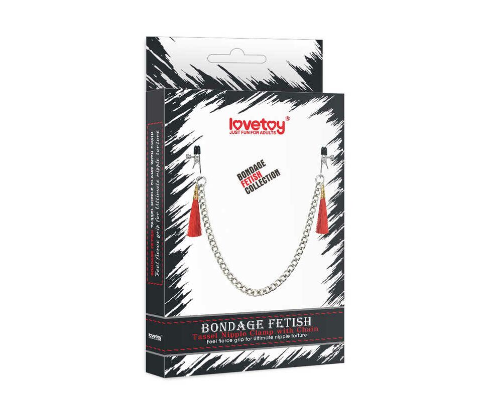 Серебристая цепочка с зажимами на соски, декорированная красными кисточками. Фиксаторы с регулировкой размера и степени сжатия. На кончиках фиксаторов мягкие силиконовые насадки.