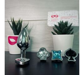 Пробка анальная металлическая с набором сменных кристаллов в виде мастей игральных карт. Будь неотразима и не предсказуема для своего короля! Характеристики: Цвет: Серебро Материал: Металл Длина: 7 см Диаметр: 2,8 см